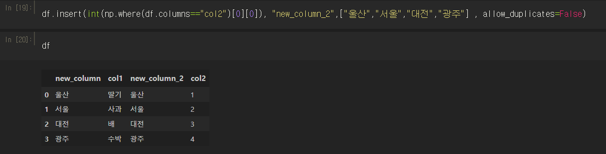 위처럼 np.where를 이용해 column을 추가하고자 하는 기준이 되는 column은 index정보를 가져와 기준 column의 앞뒤에 새로운 column을 추가할 수 있습니다.